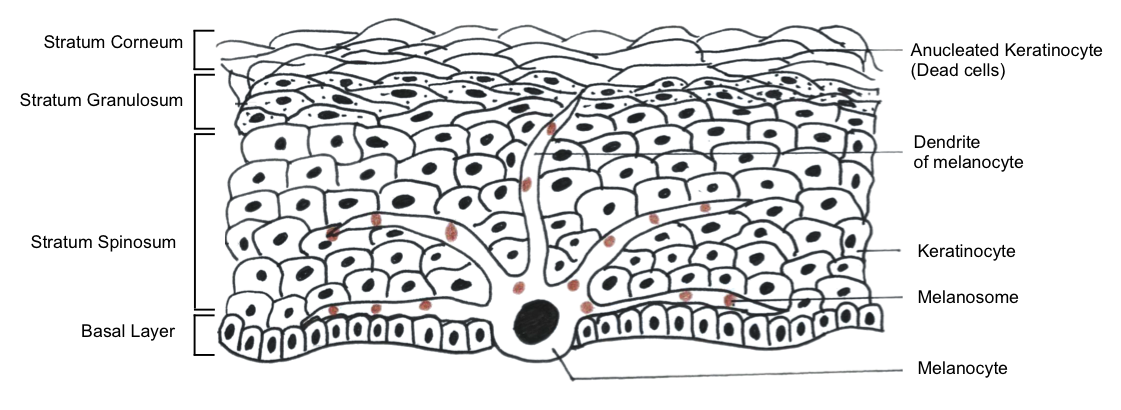 A single exposure to UVR increases the size of the melanocyte with increase in the activity of the enzyme required for melanin synthesis (tyrosinase). Repeated UVR exposure leads to increase in the number of highly active melanosomes as well as increase transfer of melanosomes to the neighbouring keratinocyte which results in tanning (see the little brown dots in the above diagram).