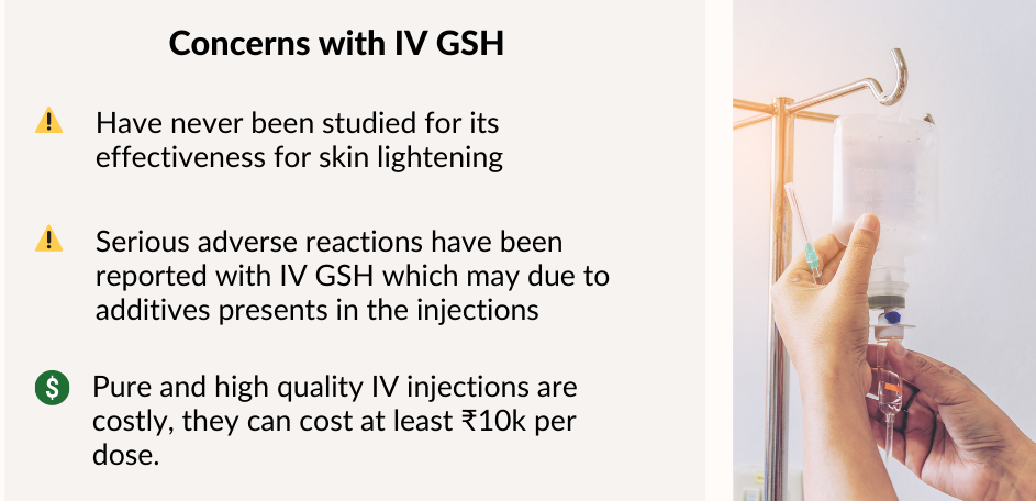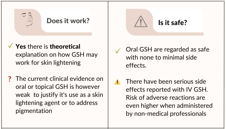 Glutathione (GSH) either as oral supplements or IV drips as skin lightening agents are the go-to treatments for glowing and bright skin especially in Asian countries and India, where the quest for fair skin is a never ending journey.