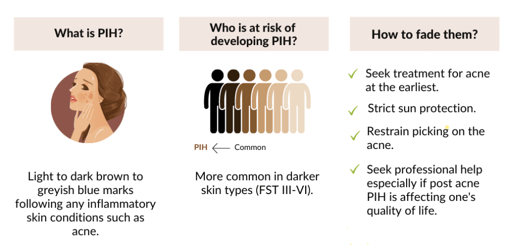 PIH can cause more concerns for individuals with acne than the acne itself but the good news is that, PIH are lesser evils of all pigmentation issues that occurs in our skin, they are preventable and completely treatable for many.