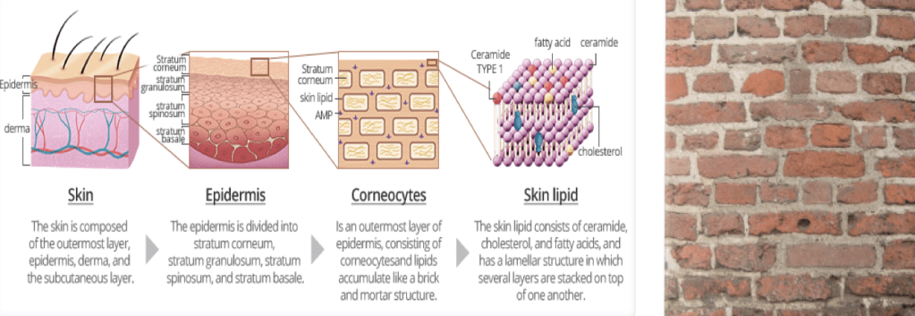 The upper layer of the skin (epidermis) is described as resembling a “brick and mortar” structure.