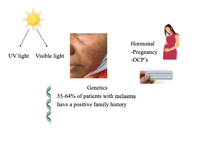 Cause of melasma is multifactorial and factors such as UV radiation, elevated estrogen (female hormones) level work together to result in melasma in genetically predisposed individuals