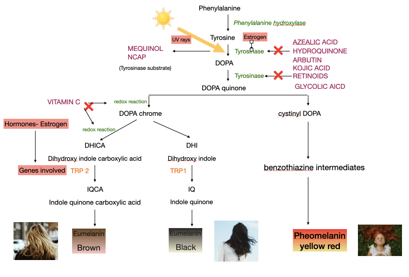 Melanogenesis i.e process of melanin formation in melanocytes (cells for melanin production). The 3 main types of melanin are eumelanin brown, eumelanin black & phaeomelanin (yellow red). Humans have all 3 types but the ratio of each type of melanin is different in different ethnic group. For eg more pheomelanin is present in red heads with pale fair skin, more of brown eumelanin is seen in blondes and more of eumelanin black is seen in brown-black skin type with black hair.