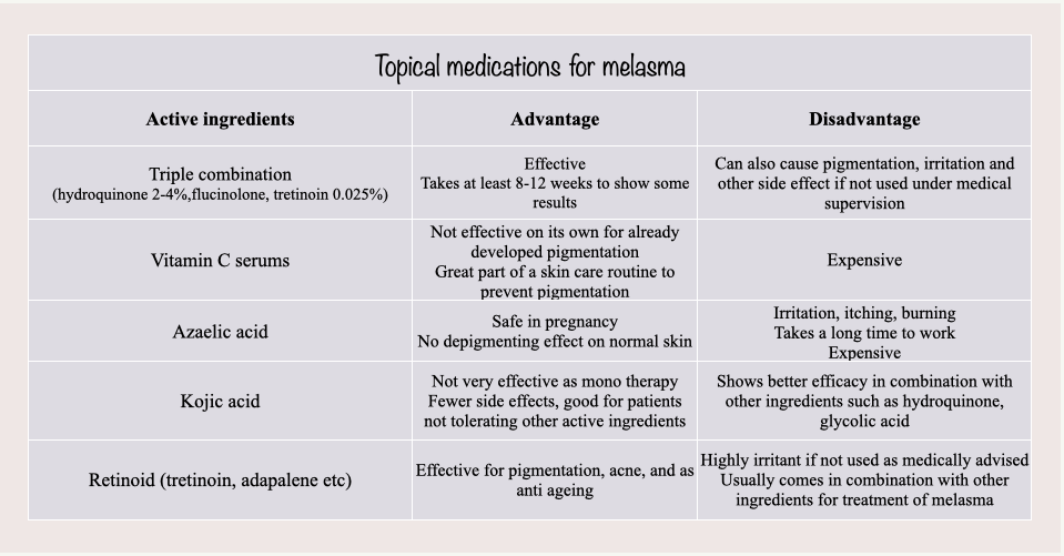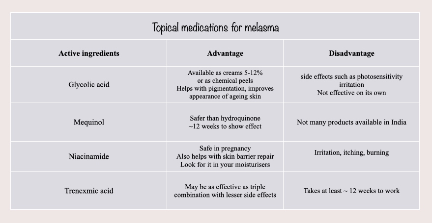 If you are on medications such as oral contraceptive pills containing estrogen or drugs for seizures such as phenytoin which could be the potential cause of the melasma, then its best to speak to your treating physician for a possible changeover of the medications.