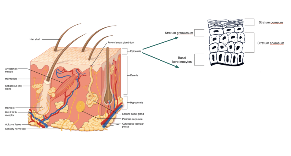 The skin has 3 layers : epidermis (uppermost) , dermis (middle) & sunbcutaneous fat (lowermost). The epidermis itself is divided into 4 layers (basal layer, stratum spinosum, stratum granulosum and the statum corneum.